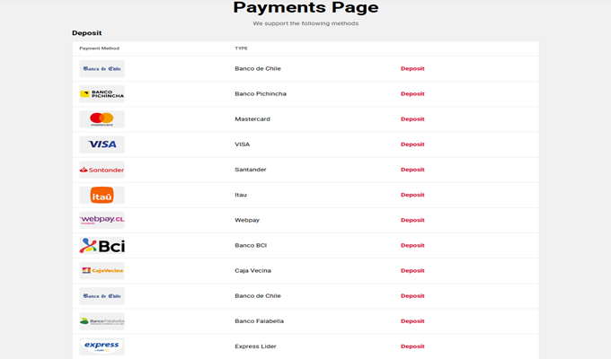 - Chile: Banco CrediChile, Banco de Chile, Banco Estado, Banco Falabella, Banco Santander, BCI, Caja Vecina, Express Lider, Itaú, Khipu, Mach, Master Debit, Mastercard, ScotiaBank, Sencillito, Visa, Visa Debit, WebPay.
