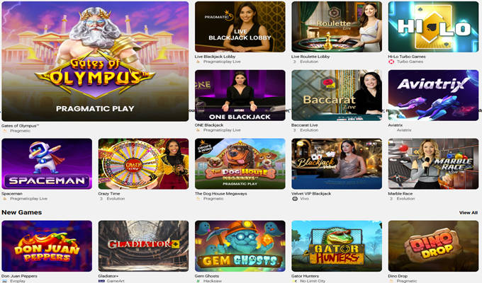 Tipos de jogos : O cassino oferece mais de 5.000 caça-níqueis e mais de 5.000 jogos no total, incluindo cassino ao vivo, jogos de mesa, jogos de crash e uma seção de apostas esportivas.