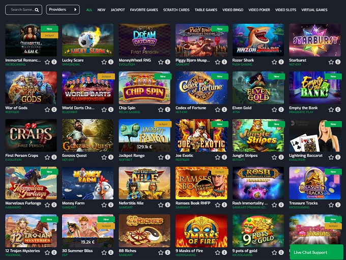 - Mais de 10.000 jogos de slots de desenvolvedores de primeira linha como NetEnt, Play'n GO, Pragmatic Play, Push Gaming e Yggdrasil.