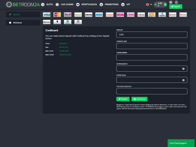 Nossa avaliação : Em meu próprio teste, depositei via ETH na Betroom24 e recebi os fundos na carteira do jogo instantaneamente. O saque via Skrill levou menos de 24 horas – sem problemas, sem atrasos. O KYC leva até 48 horas e o tempo de processamento é de até 24 horas. Carteiras eletrônicas/Cartões de crédito/débito: até 24 horas e Transferência bancária: até 2 dias úteis. Isso é ótimo de acordo com os padrões da indústria.