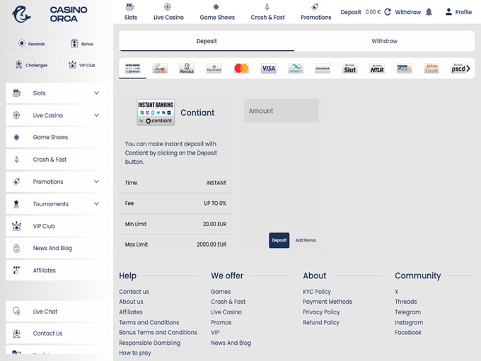 O Casino Orca aceita mais de 25 métodos de pagamento, desde Visa e Mastercard até Jeton, Apple Pay e criptomoedas como BTC, ETH, DOGE e USDT.
