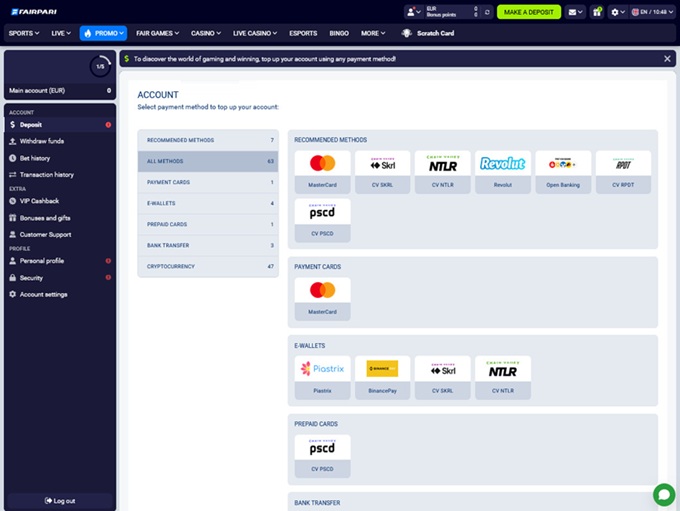 O cassino FairPari aceita tanto moedas fiduciárias quanto diversas criptomoedas, o que permite a participação de vários jogadores. Isso também é uma vantagem para jogadores que entendem de criptomoedas.