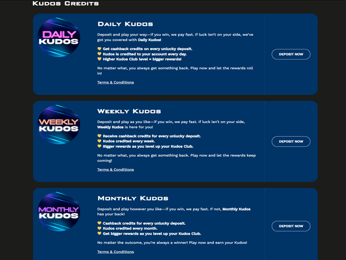 Em vez de grandes bônus de depósito iniciais, o Kudos Casino enfatiza seu programa de fidelidade Kudos Club :