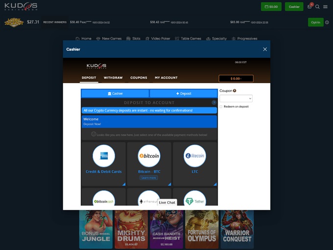O Kudos Casino oferece uma mistura diversificada de tipos de jogos do principal fornecedor, Real Time Gaming (RTG).