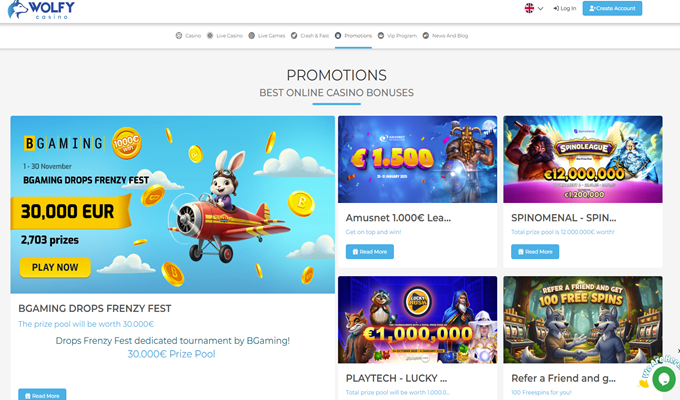 O grande diferencial do Wolfy é o seu bônus de boas-vindas sem requisitos de aposta — algo raro de se encontrar. Você pode reivindicar até € 1.000 em quatro depósitos.