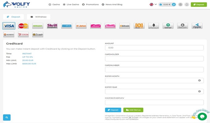 A Wolfy oferece uma combinação moderna de criptomoedas e moedas fiduciárias: BTC, ETH, LTC, Monero, Ripple, USDT, além de métodos tradicionais como Visa, Skrill, Neteller, Jeton e outros. Usei Litecoin para depósitos e um cartão Visa para saques — ambos funcionaram perfeitamente.